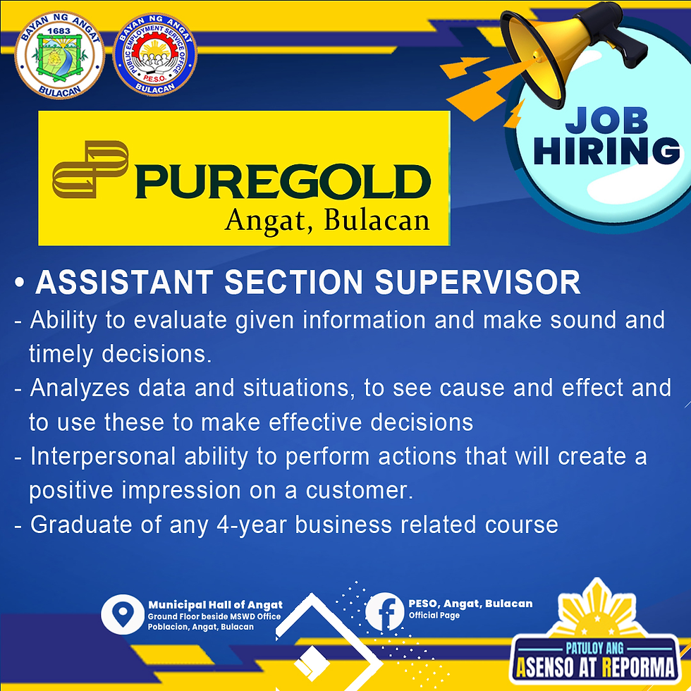 Nag-anunsyo ang Public Employment Service Office (PESO) Angat ng mga bagong pagkakataon sa trabaho para sa mga Angateñong naghahanap ng karera sa larangan ng retail at store operations. Ang mga bakanteng posisyon ay kinabibilangan ng Management Trainee, Audit Staff, Team Leader, at Assistant Section Supervisor.